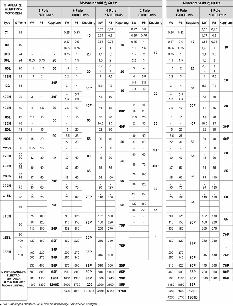 Auswahltabelle ROTOFLUID Flüssigkeitskupplungen für 50Hz, 60Hz UNEL MEC Elektromotoren