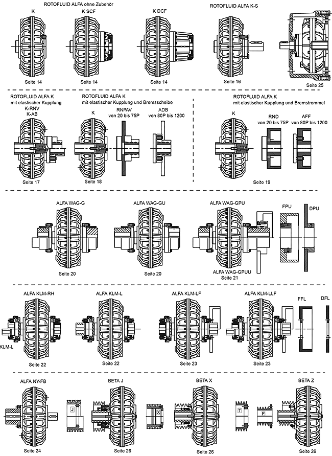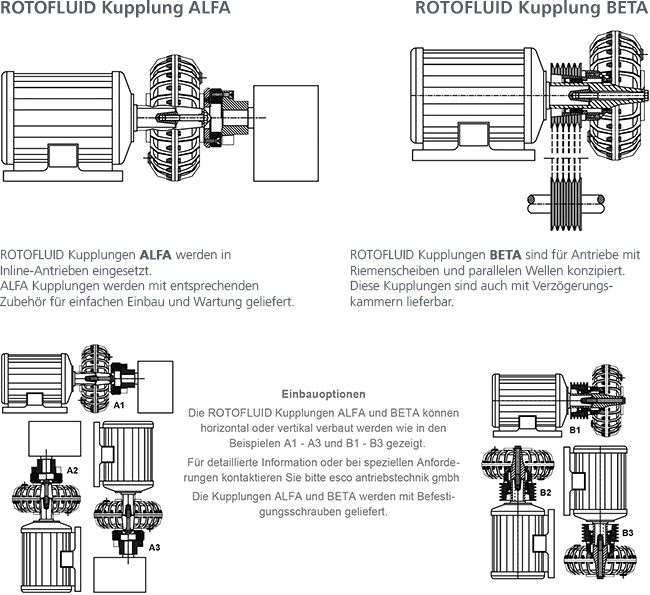 Ausführungen ROTOFLUID Flüssigkeitskupplungen - ALFA für Inline-Betrieb / BETA für Riemenscheiben